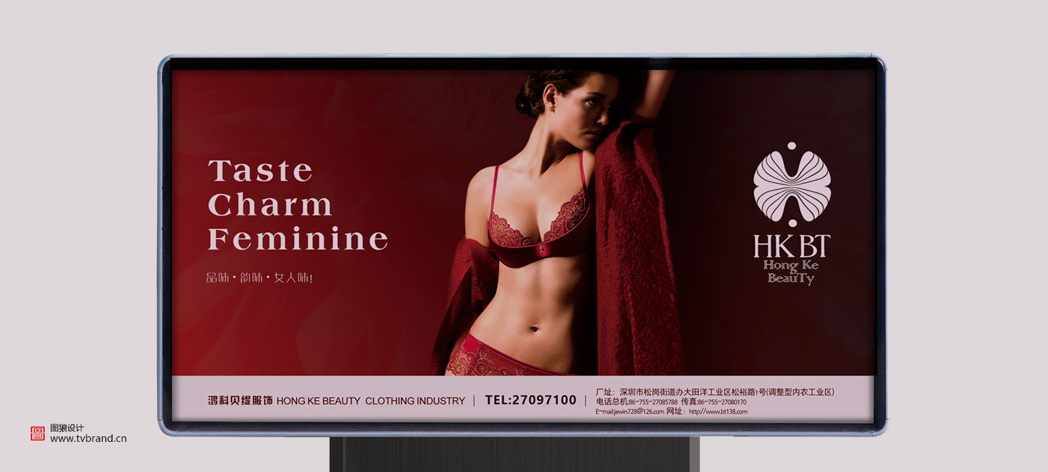 +服务客户: 深圳鸿科贝缇服饰有限公司 +所属行业: 服饰 +服务项目: 标志设计、VI视别系统设计、终端物料、画册设计、展厅设计 +项目背景: 鸿科贝缇服饰有限公司是一家主要从事服装的设计、生产、销售的民营企业,旗下主要品牌是衣馨内衣品牌。